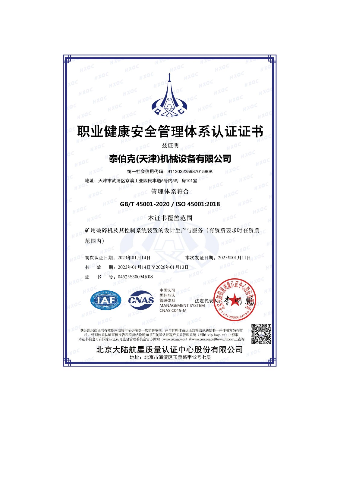 职业健康安全管理体系证书